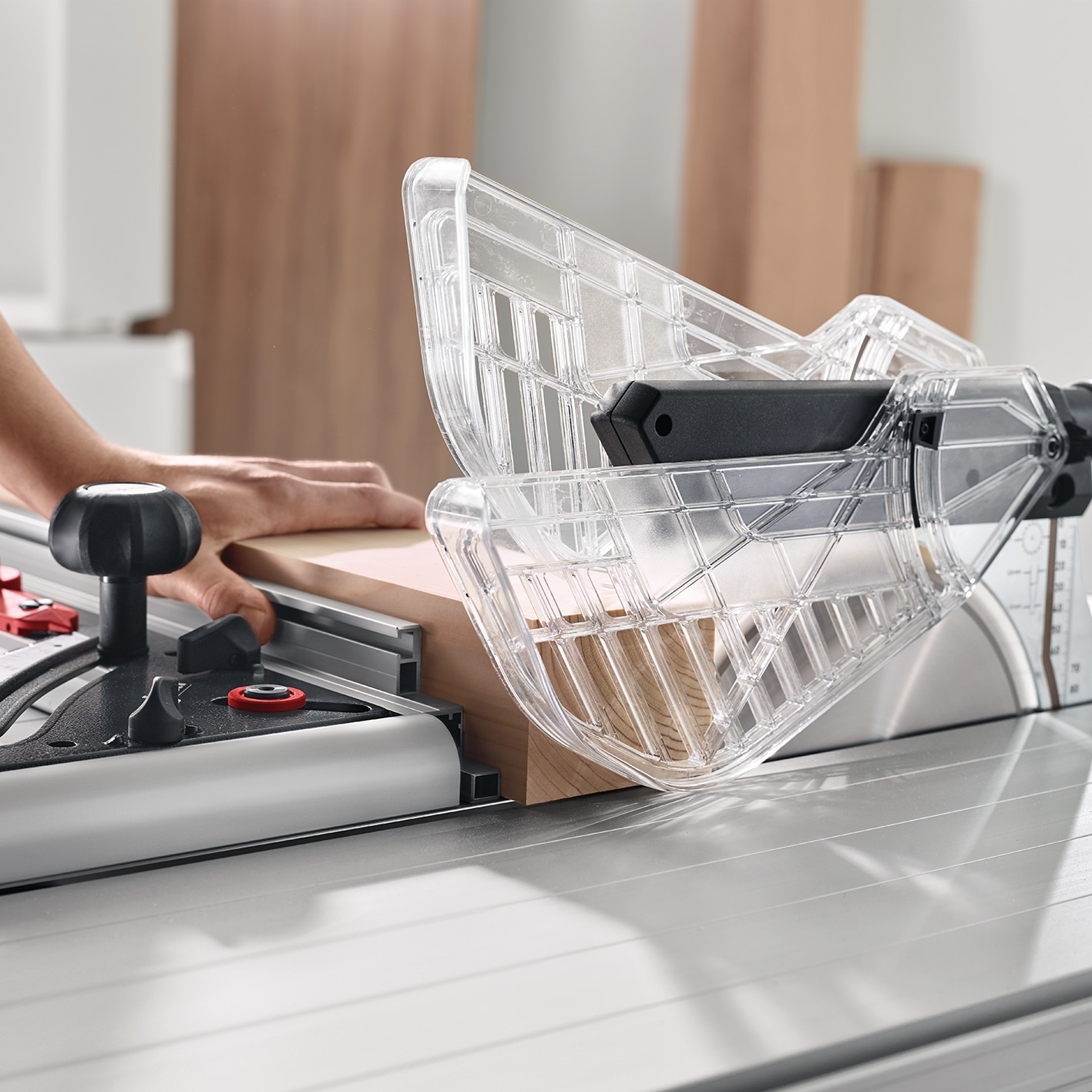 Yderligere fordele ved ERIKA 85: Ekstrem stabilt bord, kip område fra -3° til 48°, en spaltekniv, som kan nedsænkes og en maksimal snitlængde på 430 mm.