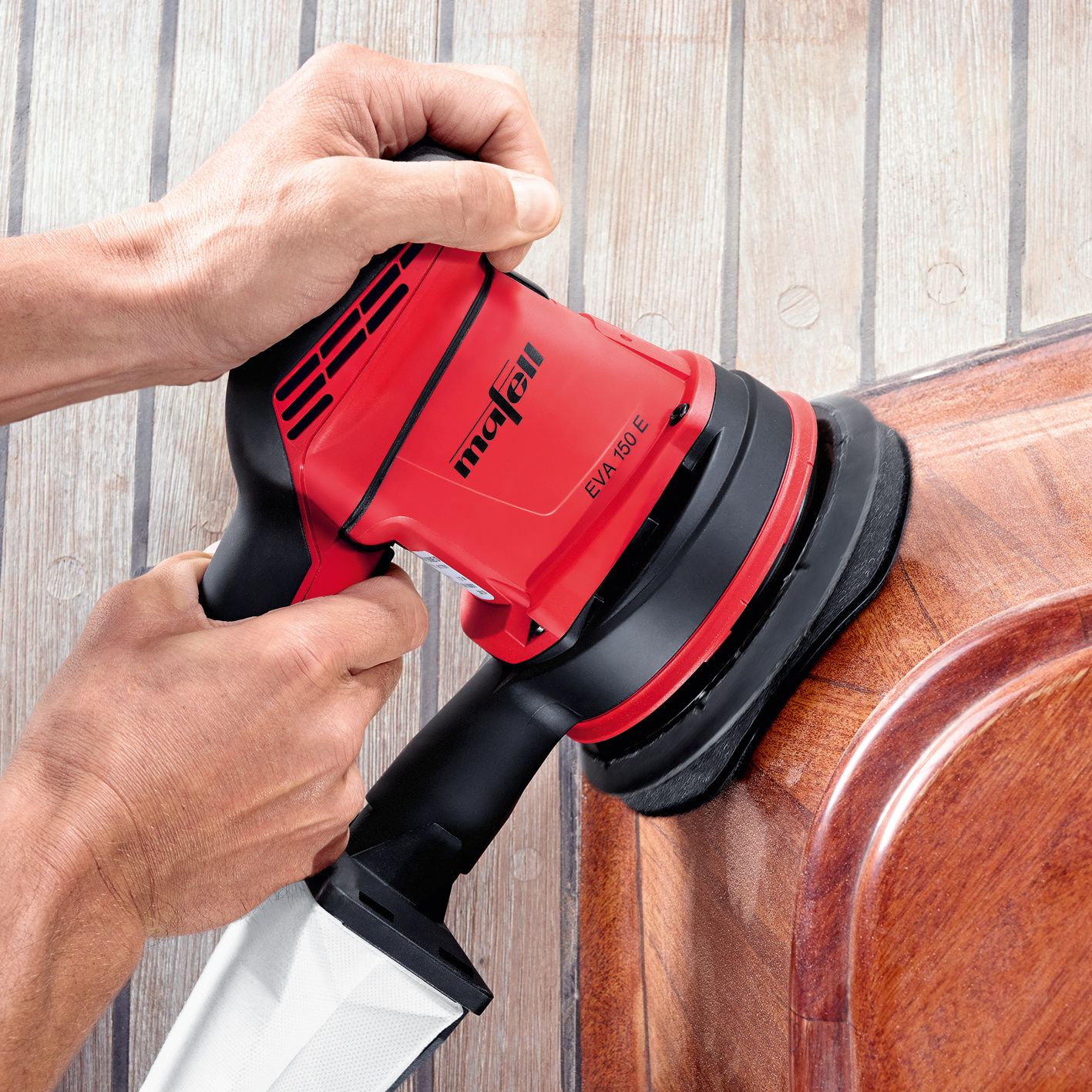 EVA 150 E er bare den excentersliber til højt aftag, et rent værksted og de bedste arbejdsresultater. Sådan får ikke kun alle træsorter og multiplexplader, men også lak, farver og spartelmasse en excellent overflade.