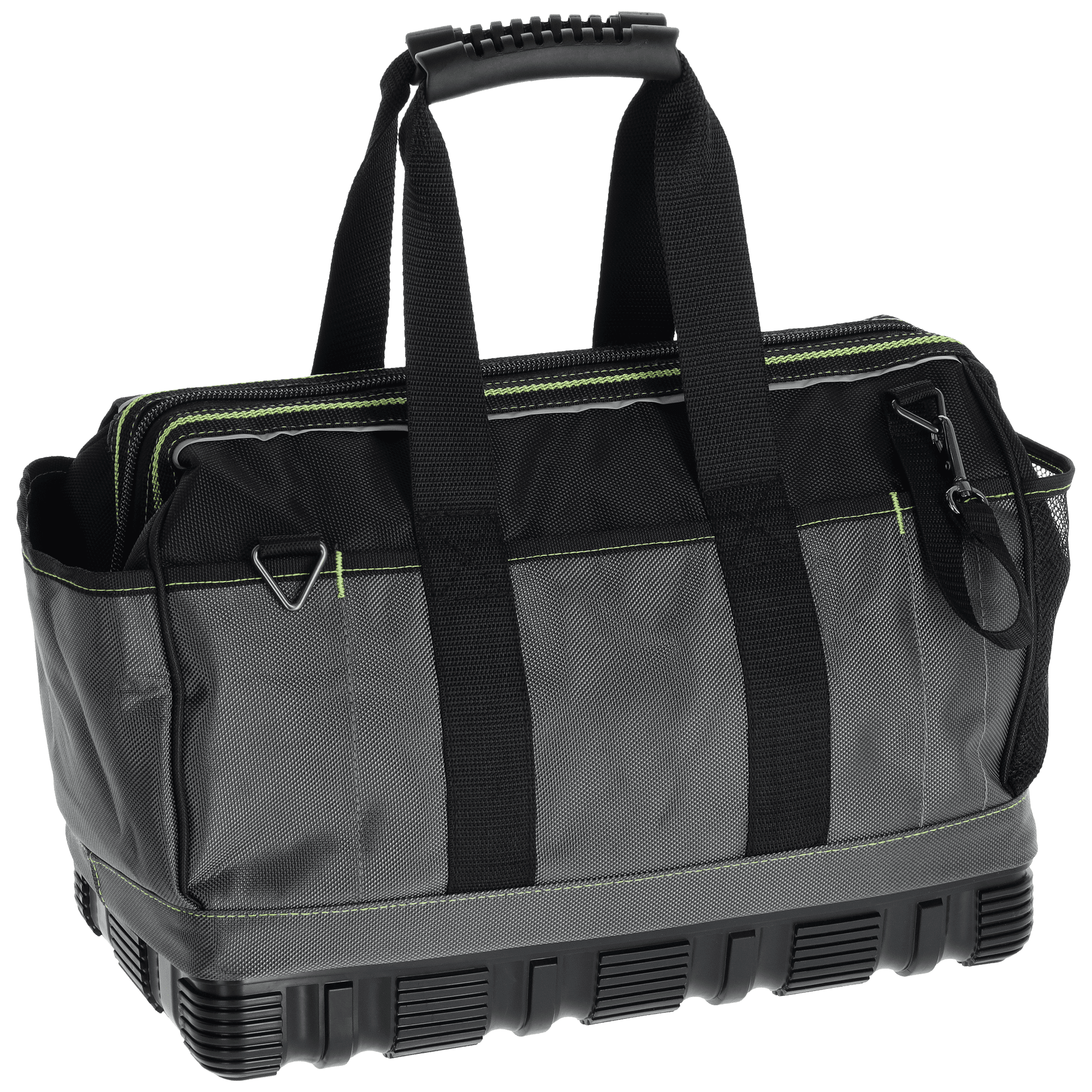 Professionel og rummelig værktøjstaske med hård plastbund, reflekselementer, justerbar skulderrem og i alt 19 lommer. Ideel til dagligt brug i værksted, montage og service.